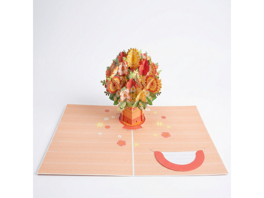 Ohromte své lásku nádherným 3D pop-up přáním s bohatou kyticí! Při otevření se před obdarovaným rozevře kouzelná prostorová kompozice plná detailně zpracovaných květin v oranžové, žluté, červené a zelené barvě, umístěných v elegantní váze.