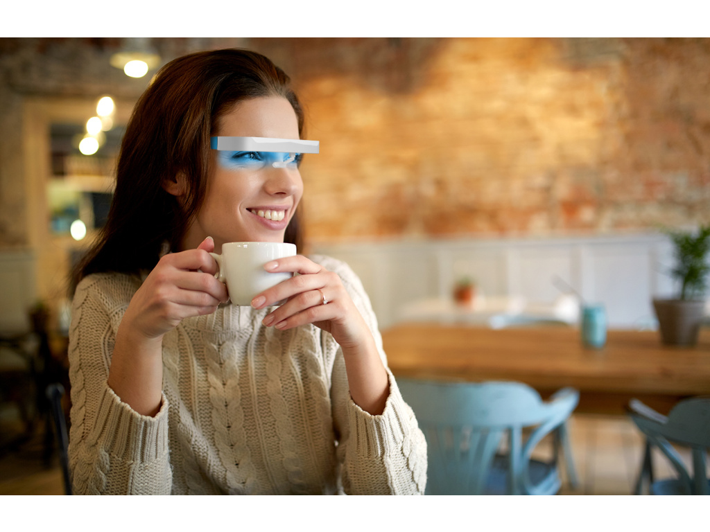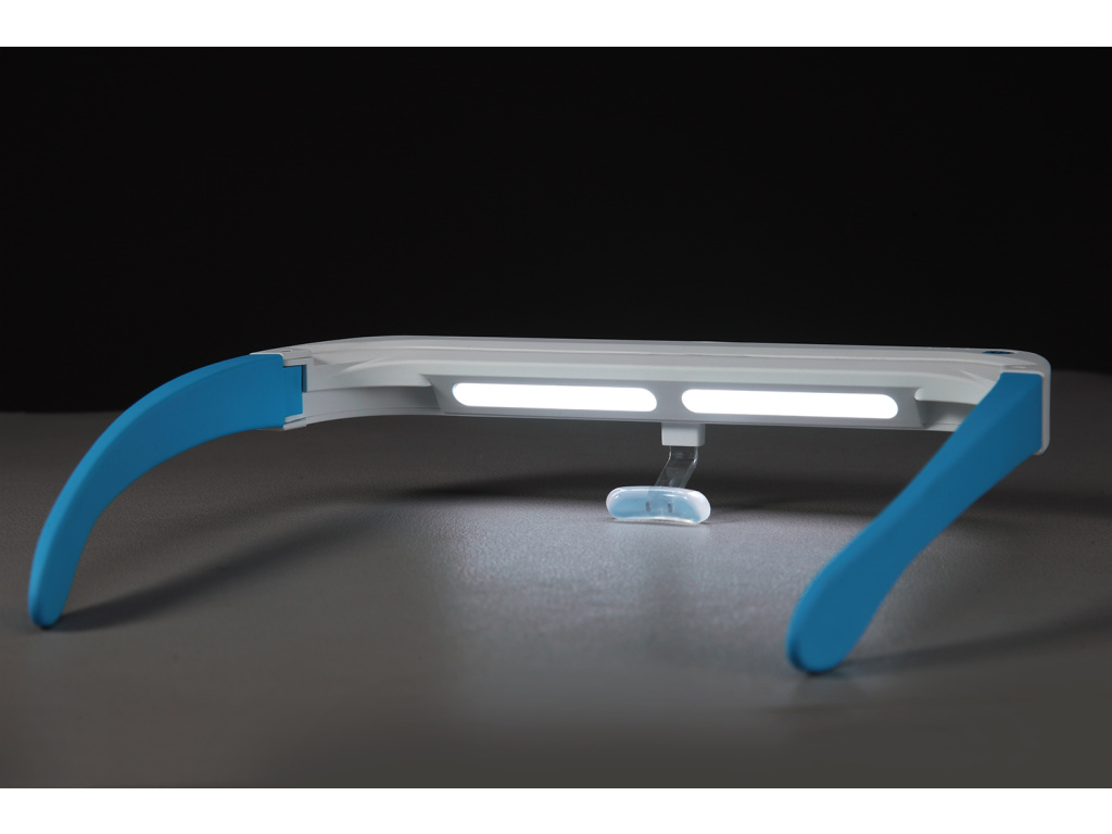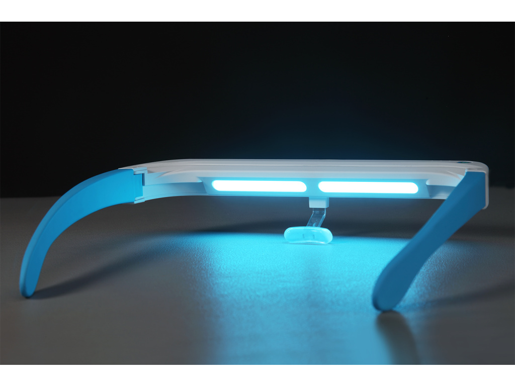 Na rozdíl od stojanových panelů pro terapii modrým světlem jsou brýle Blue-3 přenosné, umísťují se nad obočí a modré diody vytvářejí efekt modré oblohy.