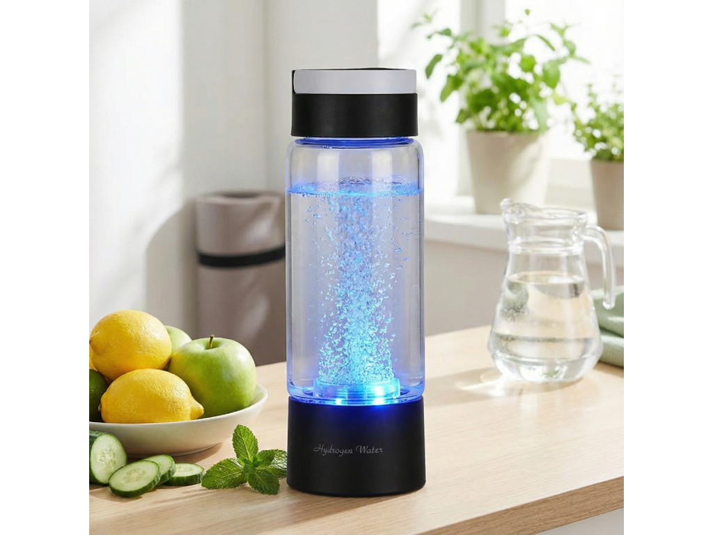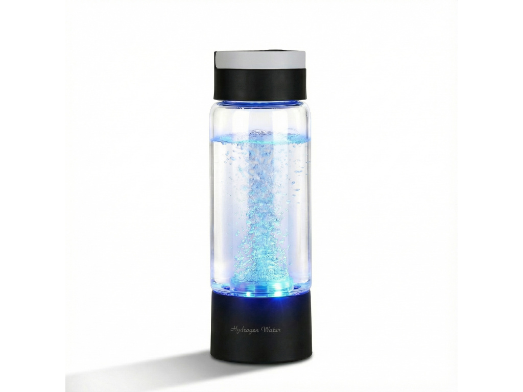 Přenosný generátor molekulární vodíkové vody, kapacita lahve 400 ml s SPE technologií výroby vodíku a PEM membránou, 3000 mAh akumulátorem a stylovým designem. Možnost inhalace plynného vodíku. Baleno v dárkové krabici. Barva bílá. Verze z borosilikátového skla.