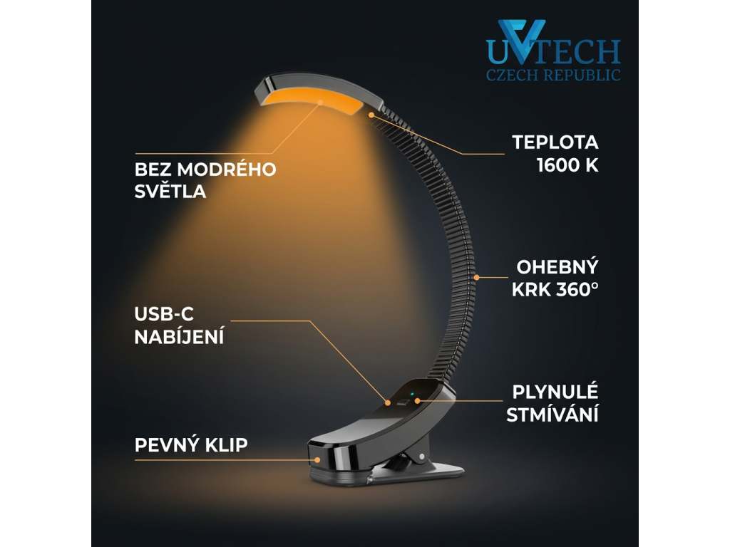 Díky pevnému klipu s rozpětím až 3 cm můžete lampičku snadno přichytit ke knize, polici, čelu postele nebo desce stolu. Ohebný krk umožňuje nasměrovat světlo přesně tam, kam potřebujete, a přizpůsobit si polohu podle situace.