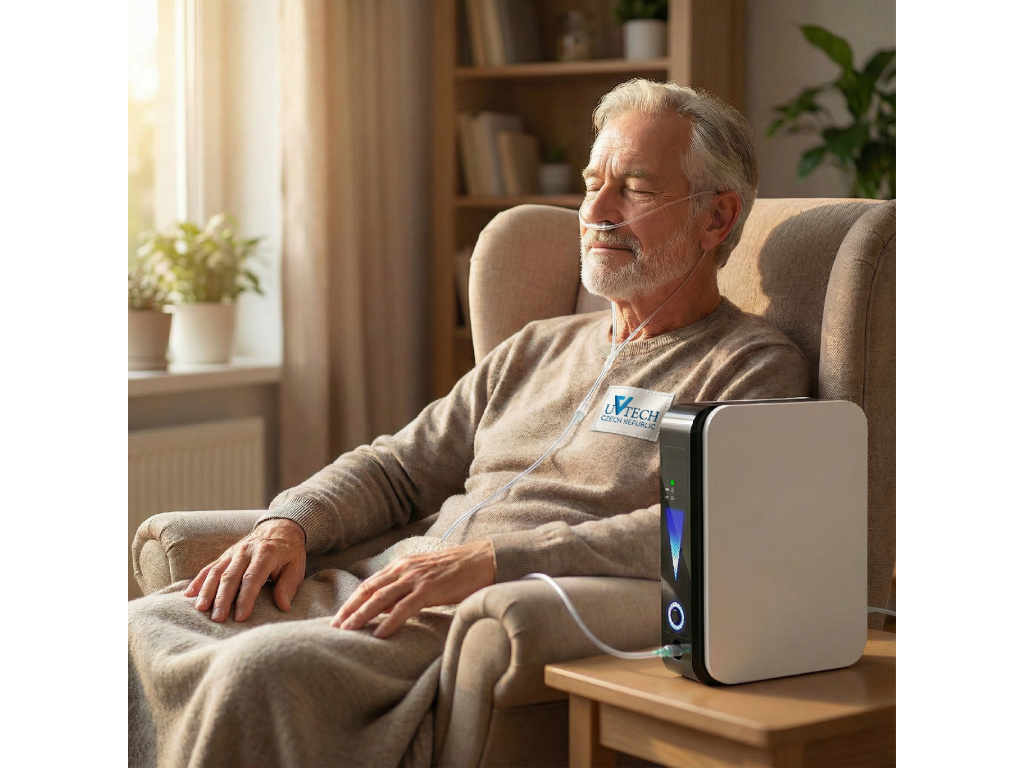Kompaktní kyslíkový koncentrátor vhodný pro kyslíkovou terapii vybavený funkcí nebulizéru pro inhalaci léčebných roztoků (např. Vincentka). Objem produkovaného čistého kyslíku 1l/min.