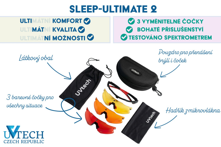 UVtech SLEEP-Ultimate 3 jsou nejlepší brýle pro spánkovou hygienu v naší nabídce. 3 výměnná barevná skla lze během sekundy vyměnit díky magnetickému mechanismu. Ergonomický design brýlí vhodný i pro všechny situace. Balení obsahuje luxusní obal, sáček i hadřík z mikrovlákna.